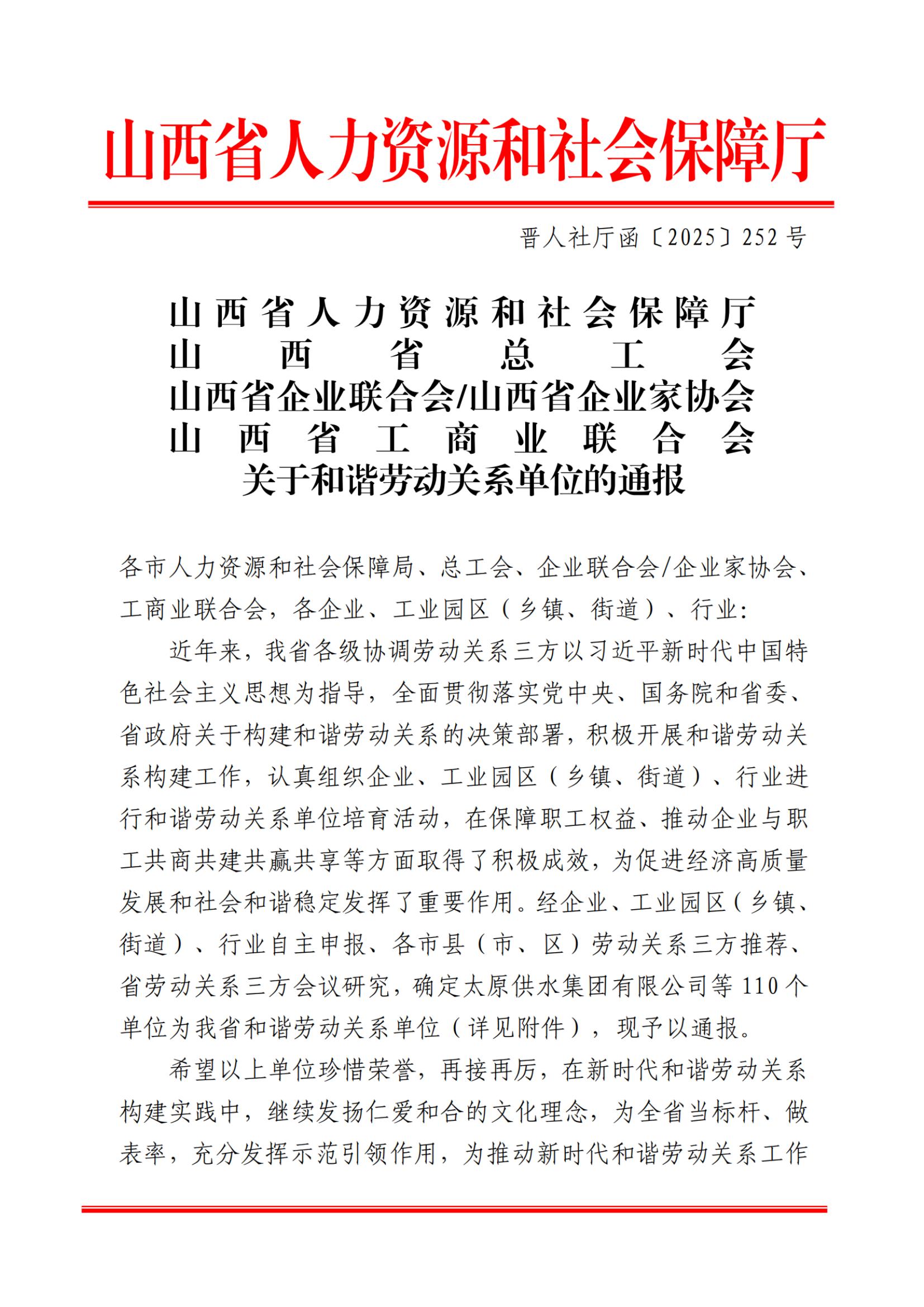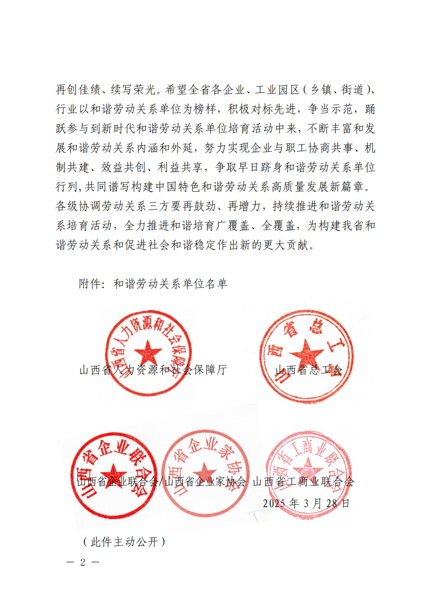 近日,山西省人社廳、山西省總工會等5部門聯(lián)合發(fā)布2025年山西省和諧勞動關(guān)系單位名單,共有110個單位入選。集團成為晉城四個和諧勞動關(guān)系企業(yè)之一。