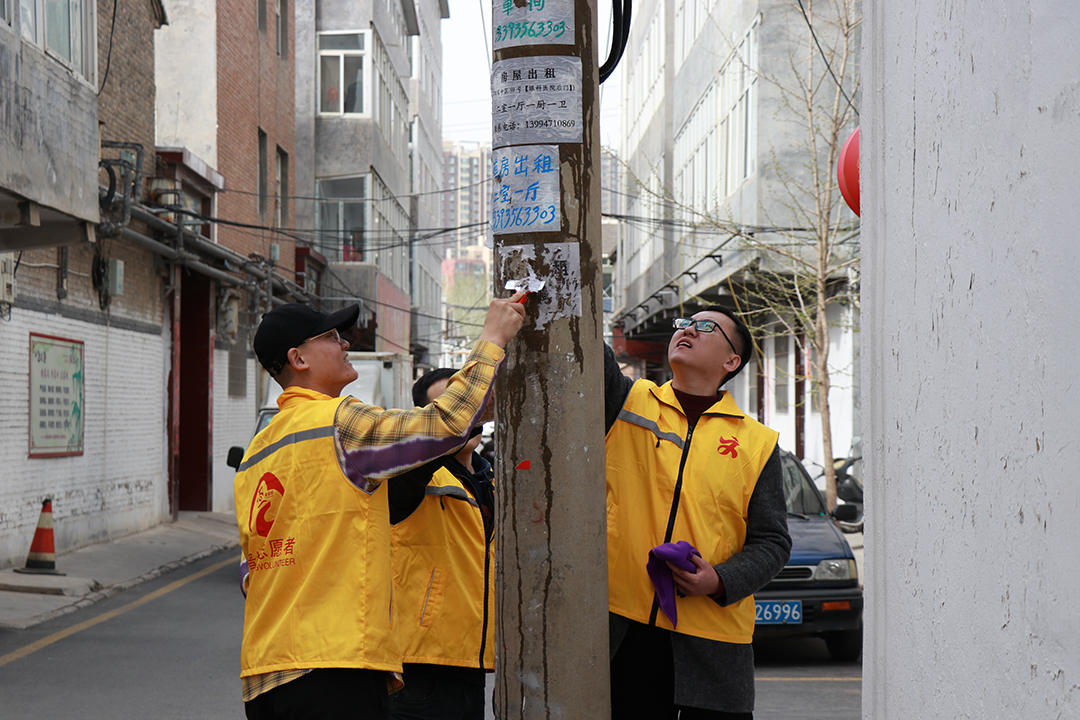 講座結束后,志愿者們深入到社區(qū)街巷,認真清除墻壁上的“牛皮癬”小廣告,對街巷內的煙頭、飲料瓶等垃圾進行清掃撿拾,并勸導各類不文明行為。